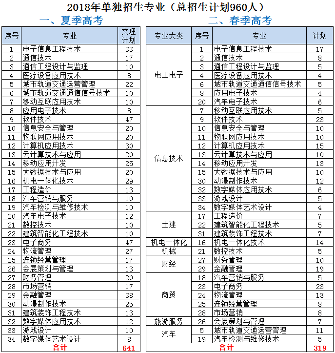 ◎2018年单独招生专业(总招生计划960人)